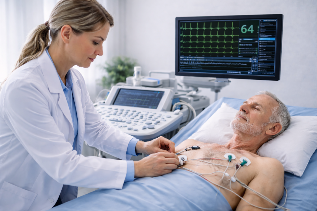 Das 12-Kanal-EKG ist eine grundlegende Untersuchung in der kardiologischen Diagnostik und bildet die Basis jeder weiteren Beurteilung. Es liefert wichtige Hinweise auf Durchblutungsstörungen, Herzinfarkte sowie Störungen der Erregungsbildung und -leitung.